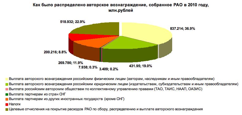 Тем не менее, падение выручки РАО наблюдалось вовсе не во всех сферах. Так, в 2010 году на 33.76% или до 22 574 млн. рублей увеличились сборы с чистых носителей и оборудования записи. Незначительно увеличились и выплаты с концертов, ресторанов, кафе и др. за публичное исполнение - на 0.21% или до 1,839 млрд. рублей.